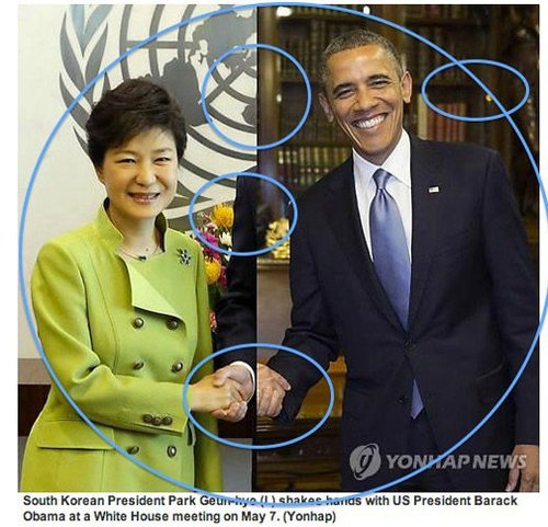 韓聯社的這張照片有明顯合成痕跡,韓聯社分別將樸槿惠與聯合國秘書長潘基文握手的照片和奧巴馬與其他人握手的照片“融為一體”,可惜卻沒能做到“兼容”。