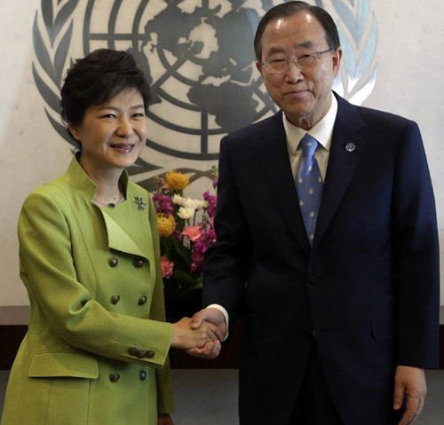 韓國總統樸槿惠與聯合國秘書長潘基文握手照(資料圖)